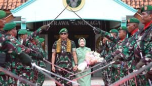 Banyuwangi – Suasana khidmat sekaligus penuh kehangatan mewarnai acara penerimaan Komandan Kodim 0825 Banyuwangi, Letkol Arm Tryadi Indra Wijaya, serta pelepasan pejabat lama, Letkol Arh Joko Sukoyo, S.Sos., M.Han., Minggu (14/09/2025). Bertempat di depan Makodim 0825 Banyuwangi, acara yang dipimpin Kasdim Mayor Kav Suprapto itu dihadiri ±300 personel TNI beserta Persit KCK Cabang XXXIX.