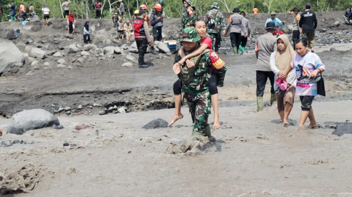 Lumajang — Di tengah derasnya banjir lahar dingin Gunung Semeru, prajurit TNI dari Kodim 0821/Lumajang kembali menunjukkan dedikasi tanpa batas dalam melindungi keselamatan masyarakat.